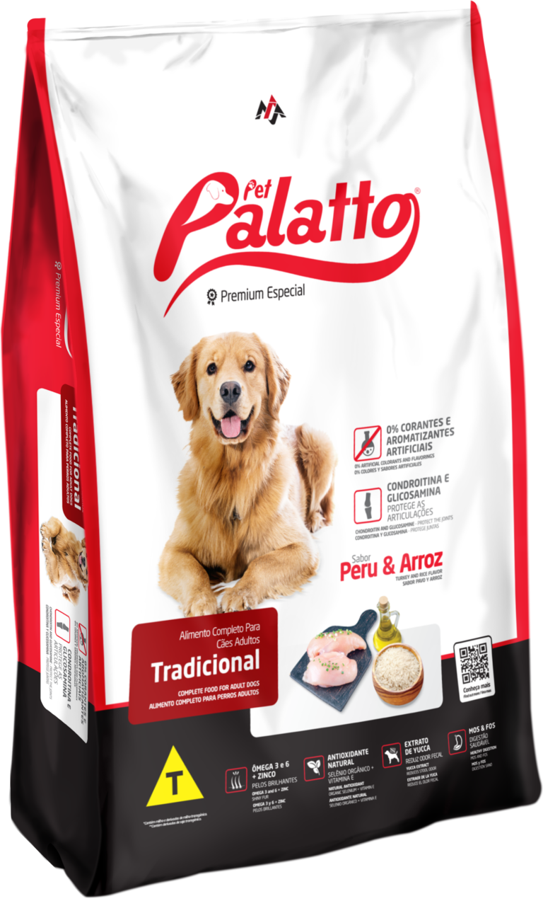 Farinha mista de aves e peru, farinha de torresmo, farinha de carne e ossos bovino, farinha de vísceras de aves, farinha de peixes, milho moído*, farelo de soja**, farelo de arroz, quirera de arroz, farelo de milho proteico*, óleo de aves, hidrolisado de fígado de aves, cloreto de sódio (sal comum), extrato de levedura, vitamina A, vitamina D3, vitamina E, vitamina K3, vitamina B1, vitamina B2, vitamina B3, vitamina B5, vitamina B7, vitamina B12, cloreto de colina, complexo de ferro aminoácido, complexo manganês aminoácido, sulfato de ferro, sulfato de cobre, monóxido de manganês, óxido de zinco, iodato de cálcio, selenito de sódio, dióxido de silício, extrato de yucca (0,01%), parede celular de levedura, aditivos prebióticos fonte de MOS e FOS, inulina, DL-metionina, L-lisina, sulfato de condroitina (mín. 0,005%), sulfato de glicosamina (mín. 0,02%), propionato de cálcio, antioxidantes (BHT, BHA, ácido cítrico, etoxiquim e propilgalato).